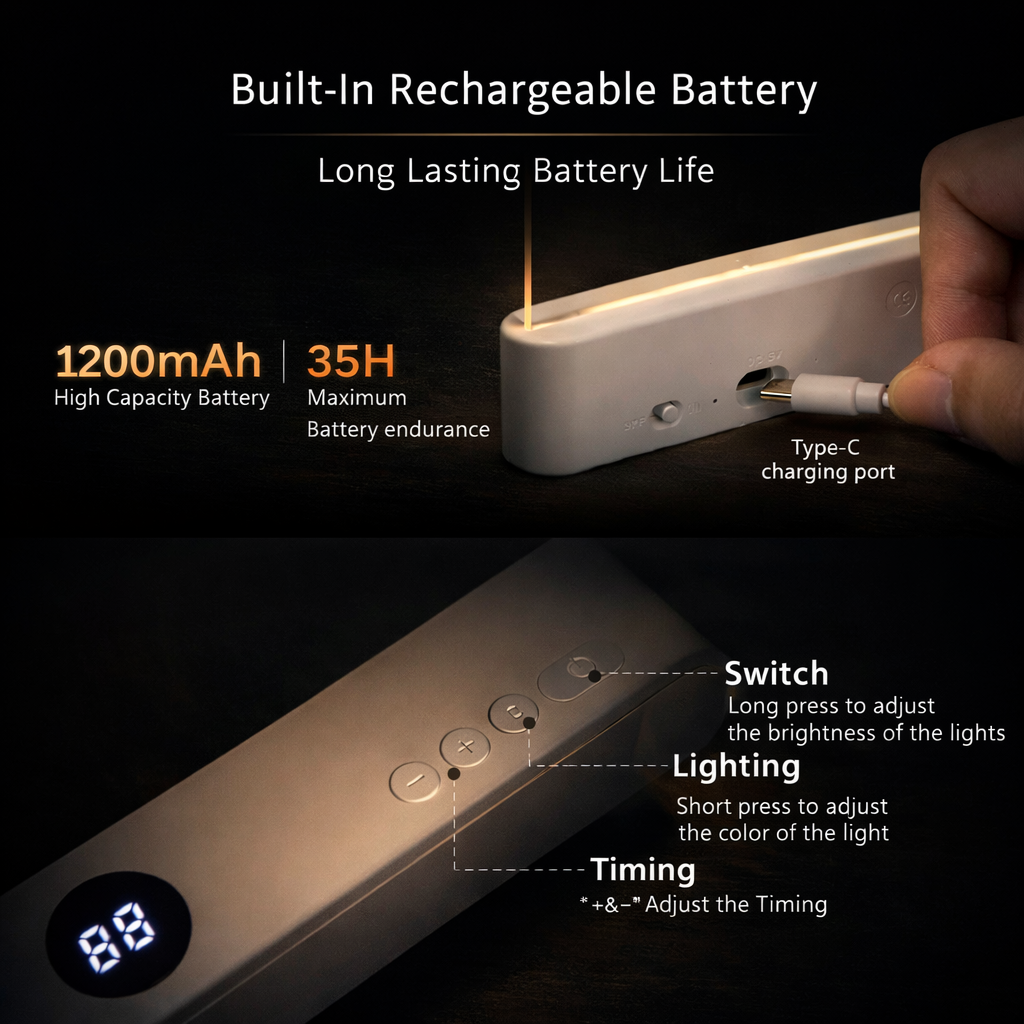 ✨Auto Timer (1-99 min) - For bedtime ✨Adjustable Brightness - Soft on the eyes ✨Rechargeable Battery - Cordless Convenience ✨3 Light Modes - Warm, Neutral & Cool
